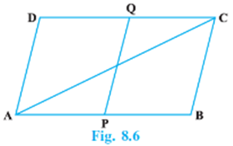 Points P and Q have been taken on opposite sides AB and CD, respectively of a parallelogram ABCD such that AP = CQ (Fig. 8.6). Show that AC and PQ bisect each other.