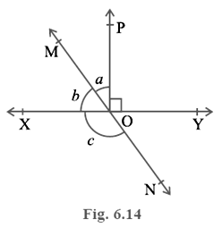 In Fig. 6.14, lines XY and MN intersect at O. If∠ POY = 90° and a: b = 2 : 3, find c.