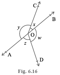In Fig. 6.16, if x + y = w + z, then prove that AOB is a line.