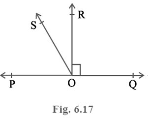 In Fig. 6.17, POQ is a line. Ray OR is perpendicular to line PQ. OS is another ray lying between rays OP and OR. Prove that∠ ROS =(∠ QOS –∠ POS).
