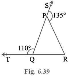 In Fig. 6.39, sides QP and RQ of Δ PQR are produced to points S and T respectively. If ∠ SPR = 135° and ∠ PQT = 110°, find ∠ PRQ.