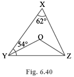 In Fig. 6.40, ∠ X = 62°, ∠ XYZ = 54°. If YO and ZO are the bisectors of ∠ XYZ and∠ XZY respectively of Δ XYZ, find ∠ OZY and ∠ YOZ.