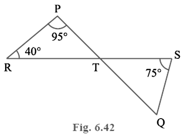 In Fig. 6.42, if lines PQ and RS intersect at point T, such that ∠ PRT = 40°, ∠ RPT = 95°and ∠ TSQ = 75°, find ∠ SQT.