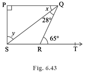 In Fig. 6.43, if PQ ⊥ PS, PQ || SR, ∠ SQR = 28° and ∠ QRT = 65°, then find the values of x and y.