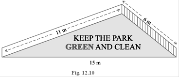 There is a slide in a park. One of its side walls has been painted in some color with a message “KEEP THE PARK GREEN AND CLEAN” (see Fig. 12.10). If the sides of the wall are 15 m, 11 m and 6 m, find the area painted in color.