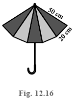 An umbrella is made by stitching 10 triangular pieces of cloth of two different colors (see Fig. 12.16), each piece measuring 20 cm, 50 cm and 50 cm. How much cloth of each color is required for the umbrella?
