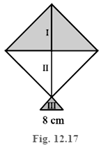 A kite in the shape of a square with a diagonal 32 cm and an isosceles triangle of base8 cm and sides 6 cm each is to be made of three different shades as shown in Fig. 12.17. How much paper of each shade has been used in it?