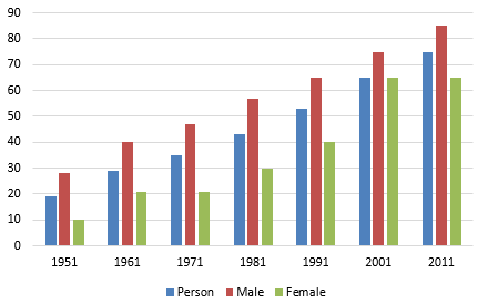 1950-51 1990-91 1998-99 2010-11 2012-13 2014-15 | 750 7,346 11,089 33,023 37,204 40,760 | 30 177 238 523 628 711 | 2,63,000 49,25,000 74,17,000 186,70,050 223,02,938 265,85,437 | 24,000 2,72,000 3,42,000 8,16,966 9,25,396 12,61,350 | |