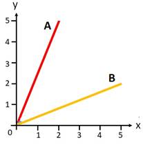 Which has more slope, A or B?