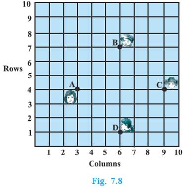 In a classroom, 4 friends areseated at the points A, B, C and D as shown in Fig. 7.8 Champaand Chameli walk into the classand after observing for a fewminutes Champa asks Chameli,“Don’t you think ABCD is asquare?” Chameli disagrees.Using distance formula, findwhich of them is correct