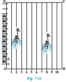To conduct Sports Day activities, in your rectangular shaped school ground ABCD, lines have been drawn with chalk powder at a distance of 1m each. 100 flower pots have been placed at a distance of 1m from each other along AD, as shown in Fig. 7.12. Niharika runs th thedistance AD on the 2nd line andposts a green flag. Preet runsththe distance AD on the eighth lineand posts a red flag. What is thedistance between both the flags? IfRashmi has to post a blue flag exactlyhalfway between the line segmentjoining the two flags, where shouldshe post her flag?
