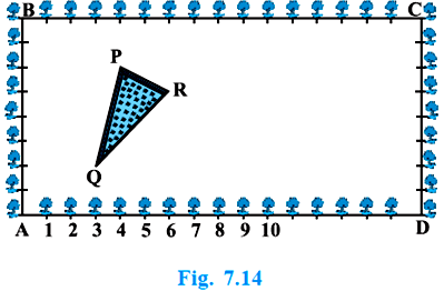 The Class X students of asecondary school inKrishinagarhave been allotteda rectangular plot of land fortheir gardening activity.Sapling of Gulmohar areplanted on the boundary at adistance of 1m from each other.There is a triangular grassylawn in the plot as shown inthe Fig. 7.14. The students areto sow seeds of floweringplants on the remaining area of the plot
