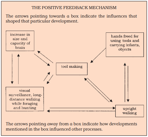Look at the diagram showing the positive feedback mechanism on page 13. Can you list the inputs that went into tool making? What were the processes that were strengthened by tool making?