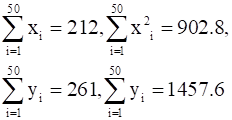 The sum and sum of squares corresponding to length x (in cm) and weight y (in gm) of 50 plant products are given below: