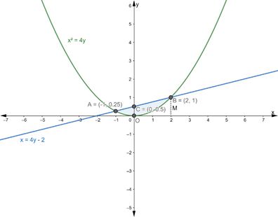 Using integration, find the area bounded by the curve x2 = 4y and the line x = 4y - 2.