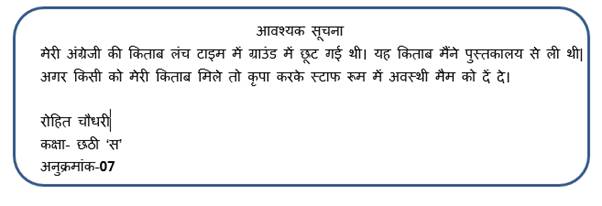 मान लो कि स्कूल में तुम्हारी कोई प्रिय चीज खो गई है। तुम चाहते हो कि जिसे वह चीज मिले, वह तुम्हें लौटा दे। इस संबंध में स्कूल के बोर्ड पर लगाने के लिए एक नोटिस तैयार करो, जिसमें निम्नलिखित बिंदु हों: