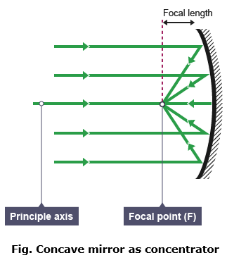 Explain the use of concave mirror as solar concentrators with the help of a ray diagram.