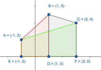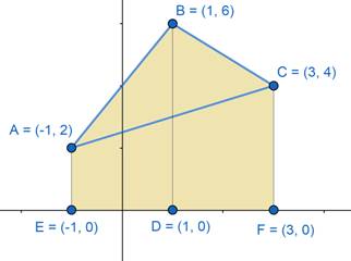 Using integration, find the area of the region bounded by the triangle whose vertices are A(-1, 2), B(1,6) and C (3,4)