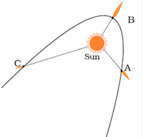 Fig. 17.6 shows comets without their tail. Show the tails of the comets at position A, B, and C. In which position will the tail be longest?