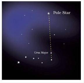 The great bear also known as the Ursa Major is a constellation present in the northern sky. To find the pole star from the Ursa Major, locate the two end stars of Ursa Major. Draw an imaginary straight line passing through these stars as shown in the figure below. Extend this imaginary line towards the north direction. This line will lead to a star which is not too bright. This is pole star.