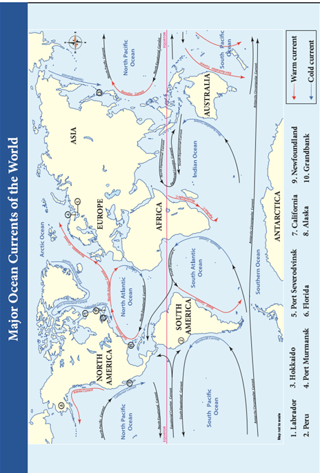 Mark the cold currents in blue and the warm currents in red in a World outline map.