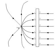 One side of conducting plate will have –ve charge induced at one surface of plate because of +ive charge q and the electric field lines will be perpendicular to the surface because the surface is equipotential and as the plate was uncharged at starting to maintain the neutrality of conducting plate +ive charge will be induced on the other side of plate.