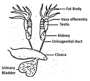 Draw a neat and well labelled diagram of male reproductive system of a frog.