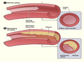 Due to narrowing of the lumen of arteries Atherosclerosis takes place. Atherosclerosis is the condition in which build-up of cholesterol, fats takes place in the wall of the artery. This causes decreased size of the lumen hence decreased flow of blood towards the heart.