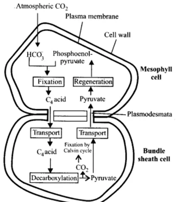 In C4 plants, initial fixation of CO2 or carboxylation occurs in mesophyll cells. The chloroplasts of mesophyll cells possess enzyme PEP carboxylase for initial fixation of CO2. The primary acceptor of CO2 is phosphoenol pyruvate. PEP combines with CO2 in the presence of PEP carboxylase to form oxaloacetate.