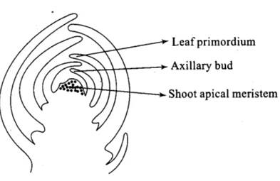 b) small cellular outgrowths occurs here called leaf primordia that later develop into leaves
