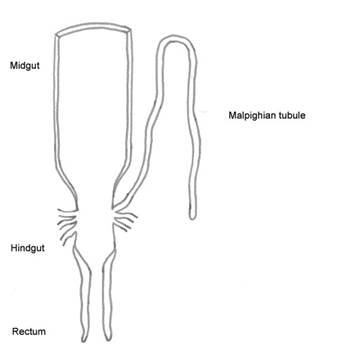 The Malpighian tubules have excretory and osmoregulatory function. The tubules are branched and extends from the alimentary canal absorbing solutes, water etc.