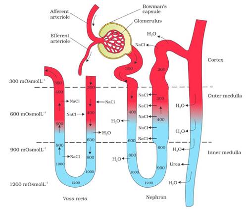 In the vasa recta, absorption of water into the blood takes place and return of the absorbed solute to the interstitium follows. This is called the countercurrent exchange mechanism.