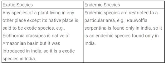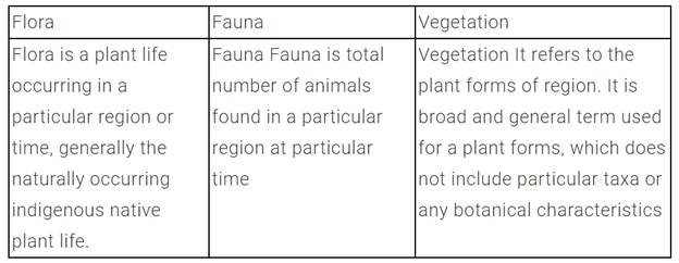 What is the difference between flora, fauna and vegetation? Eichhornia crassipes is called as an exotic species while Rauwolfia serpentina is an endemic species in India. What do these terms exotic and endemic refer to?