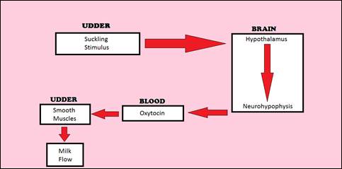 A milkman is very upset one morning as his cow refuses to give any milk. The milkman’s wife gets the calf from the shed. On fondling by the calf, the milkman got sufficient milk. Describe the role of endocrine gland and hormone associated with this response with suitable diagram.