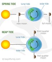 Spring tides occur when the sun and the moon are in the same line, whereas neap tides occur when the sun and moon are perpendicular to each other, as shown in the photograph.