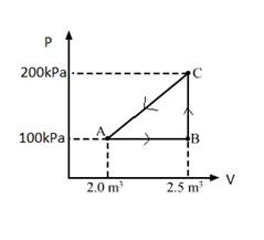 A gas is initially at a pressure of 100 kPa and its volume is 2.0 m3. Its pressure is kept constant and the volume is changed from 2.0 m3 to 2.5 m3. Its volume is now kept constant and the pressure is increased from 100 kPa to 200 kPa. The gas is brought back to its initial state, the pressure varying linearly with its volume.