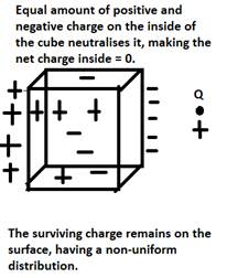 The face of the metal cube closest to the point charge, when brought near to it, had negative charge induced on it. This negative charge induces an equal and opposite positive charge on its immediate adjacent surface in the interior. In this way, the faces of the cube induce charges in the interior such that the total charge in the interior becomes zero. The net charge is on the surface of the cube, and it has a non-uniform charge distribution, consisting of both positive and negative charges.