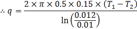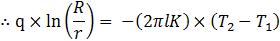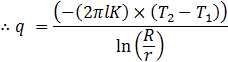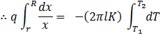 Now we integrate both the sides, taking temperature from tube to surrounding: T1 to T2 and radii from r to R