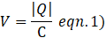 For a capacitor with net charge, Q and capacitance, C, the Potential difference deceloped in between the plates, V is,