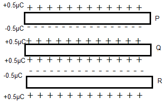 Hence the inner surfaces get a charge of ±0.5μC on each plates. Since the plate Q is positively charged, Plate P will get -0.5μC charge.