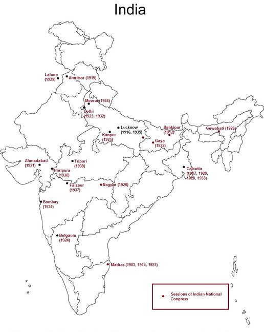 On an outline political map of India, mark the centres where sessions of the Indian National Congress were held.