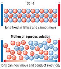 • Although the component ions of the ionic solids are not free for movement in the solid-state as they are held together by strong electrostatic forces ; they become free to move about in the molten state or aqueous state (when they get dissolved in water because) they can overcome coulombic attraction in that state and hence they have a certain amount of electrical conductivity which is high in the molten state.