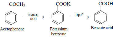 • On drastic oxidation with potassium permanganate, it forms a carboxylic acid ‘C’ which is actually benzoic acid which is formed from acetophenone.