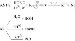 • Nitrous acid us unstable and methylamine produces alcohols sometimes alkenes by reacting with it . in intermediate step aliphatic diazonium salts are formed which being unstable forms alcohol and liberates quantitatively nitrogen gas.