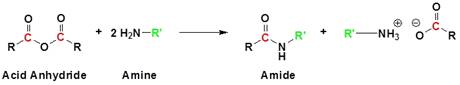 • The reaction of acid anhydrides with primary amines resembles their reaction with acyl chlorides and instead of production of HCL in case of acyl chlorides amines produce carboxylic acids in this reaction and obviously the corresponding amide as major product.