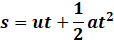 Here s is the distance covered by the ball, u is the initial velocity of the ball, a is the acceleration of the ball and t is the time required to cover s.