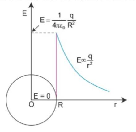 Find the electric field intensity due to a uniformly charged spherical shell at a point (i) outside the shell and (ii) inside the shell. Plot the graph of electric field with distance from the center of the shell.