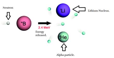 - When boron having atomic no.5 and atomic mass 10 is bombarded with neutron, the atomic no. decreases by 2 i.e.5-2=3 and the atomic mass decreases by 2 times of atomic no. i.e.4. Thus Lithium with atomic no.3 and mass number 6.