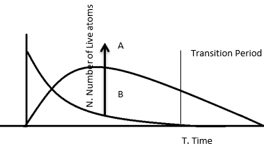 A radioactive equilibrium is established when the rate of decay and production of radioactive nuclides is same. The nucleus in this case is A that is decaying and the production nuclei is B. The daughter nuclide can further become parent to the daughter nuclide of C, but in this question we have to find the relationship between nucleus A and B. The strength of the daughter nuclei depends on the half-life and decay constant. As mentioned earlier, the rate of production and decay are same, therefore the number of atom present with respect to time will become same for both the parent and daughter but before equilibrium both the parent and the daughter will go through, what we call a transition period. That means in our case the number of parent nuclei A decreases overtime as time goes on and due to radioactive decay law the rate of production of the number of live atoms for B increases to a maximum point and then again decays with time to achieve equilibrium with A. therefore, the graph depicting the production and decay of both B and A is