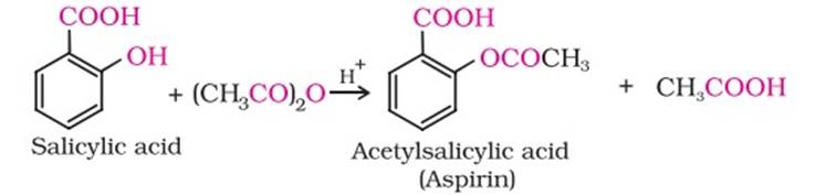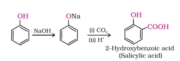 Aspirin is also known as acetylsalicylic acid. Phenol is treated with NaOH to produce phenoxide ion. Phenoxide ion then undergoes electrophilic substitution with CO2 to yield salicylic acid as the major product. This is called kolbe’s reaction.